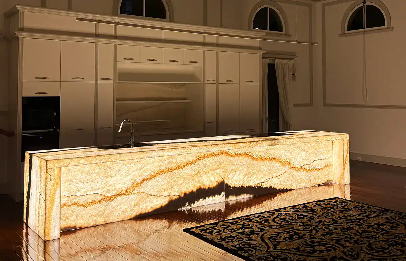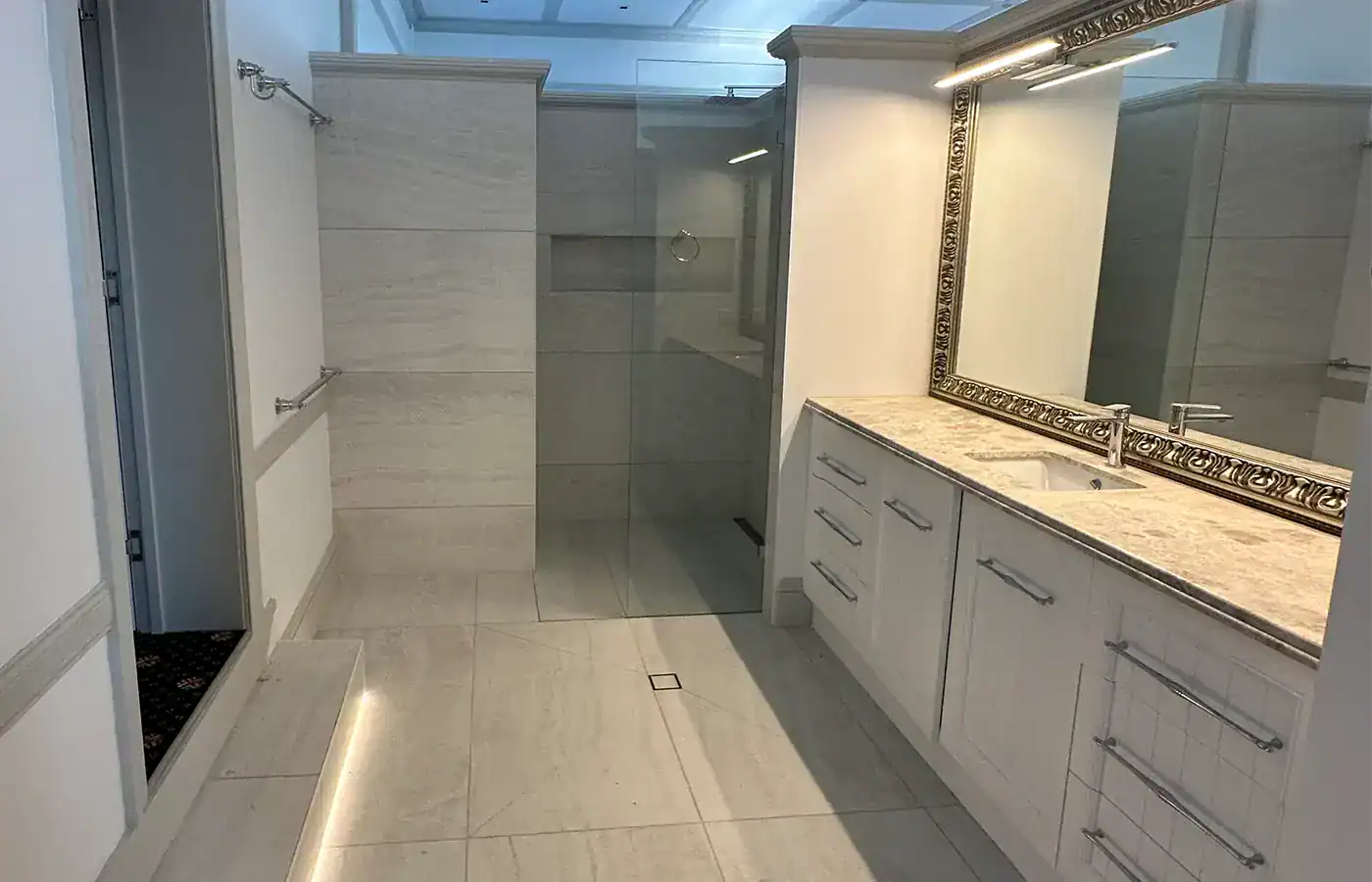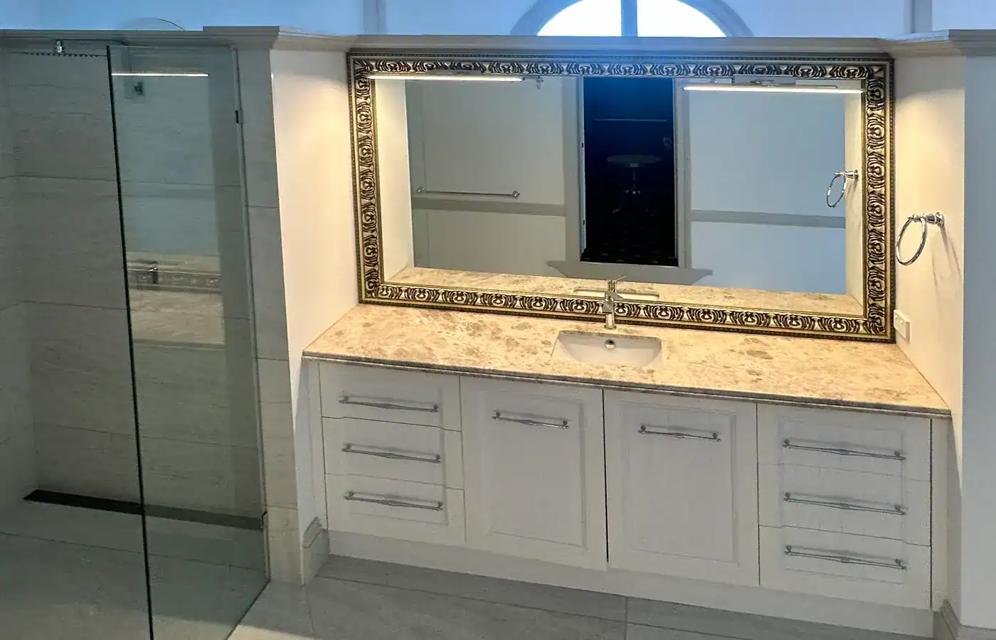 Once cleared, we completed a full rewire of the entire property, installing a brand-new main switchboard, modern safety switches, dedicated circuits, updated earthing and new cabling to meet current Australian electrical standards. To complement the home’s architectural features, we designed and installed premium LED lighting—including wall sconces, feature lighting on the mezzanine levels, integrated kitchen task lighting and the striking backlit stone island bench that now stands as a centrepiece. All switches, outlets, USB charging points, smoke alarms and smart wiring were upgraded to high-quality modern fittings to match the luxury finish of the renovation.